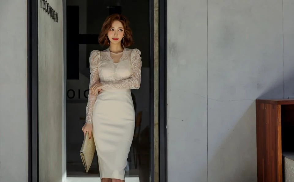 189 女子力アップワンピース シアーレースインサート ロングスリーブミディドレス